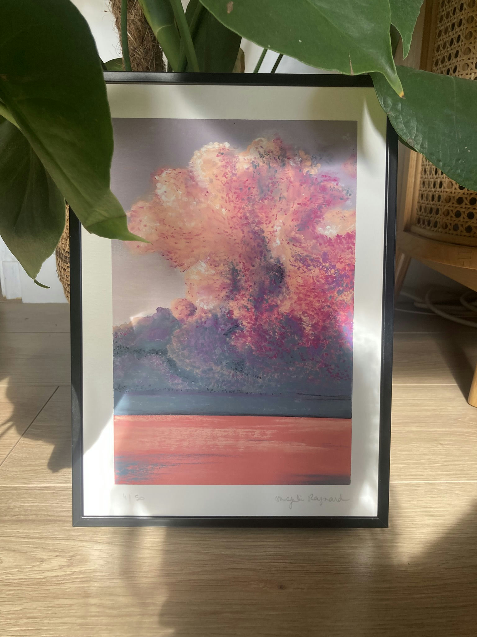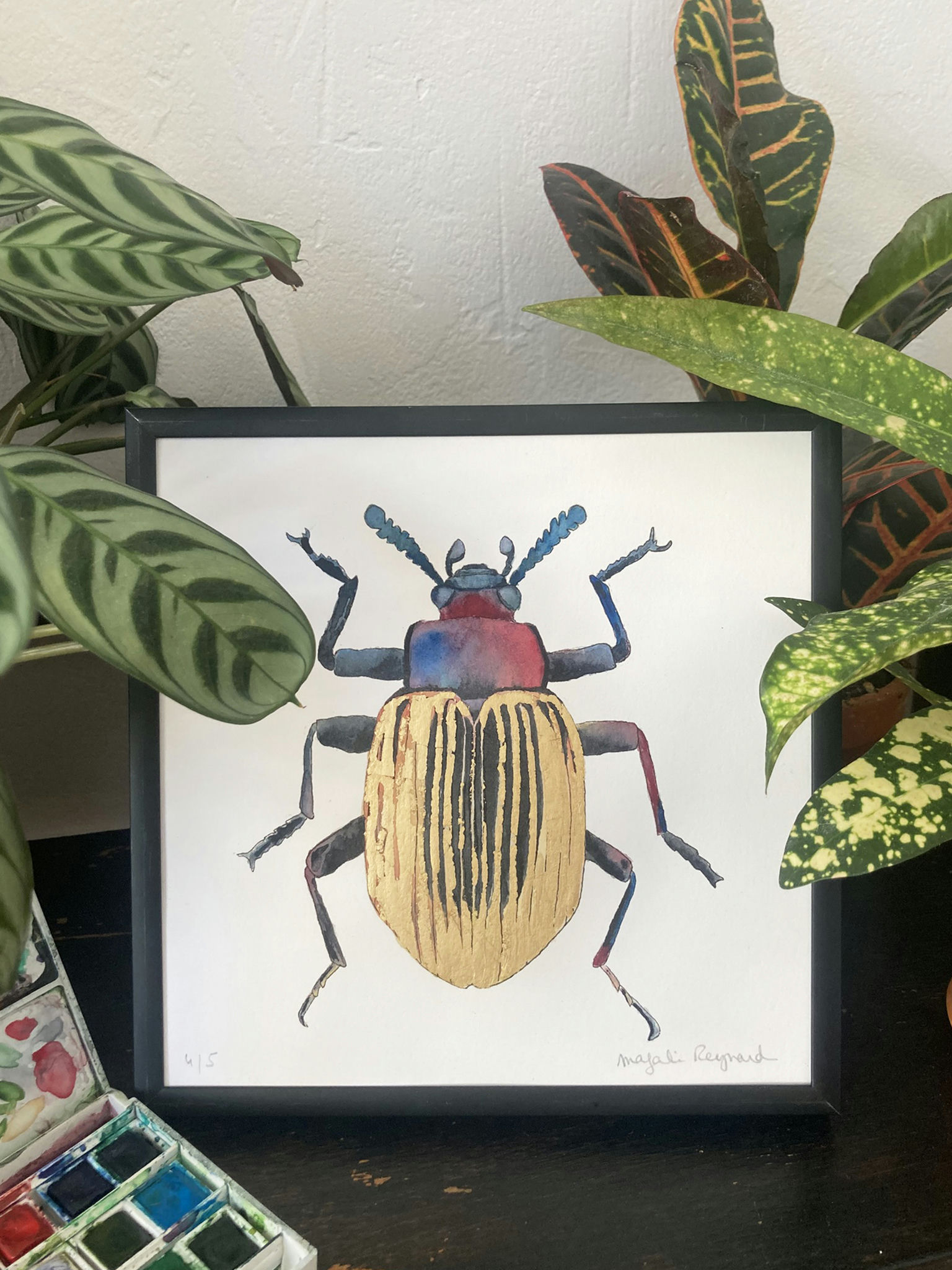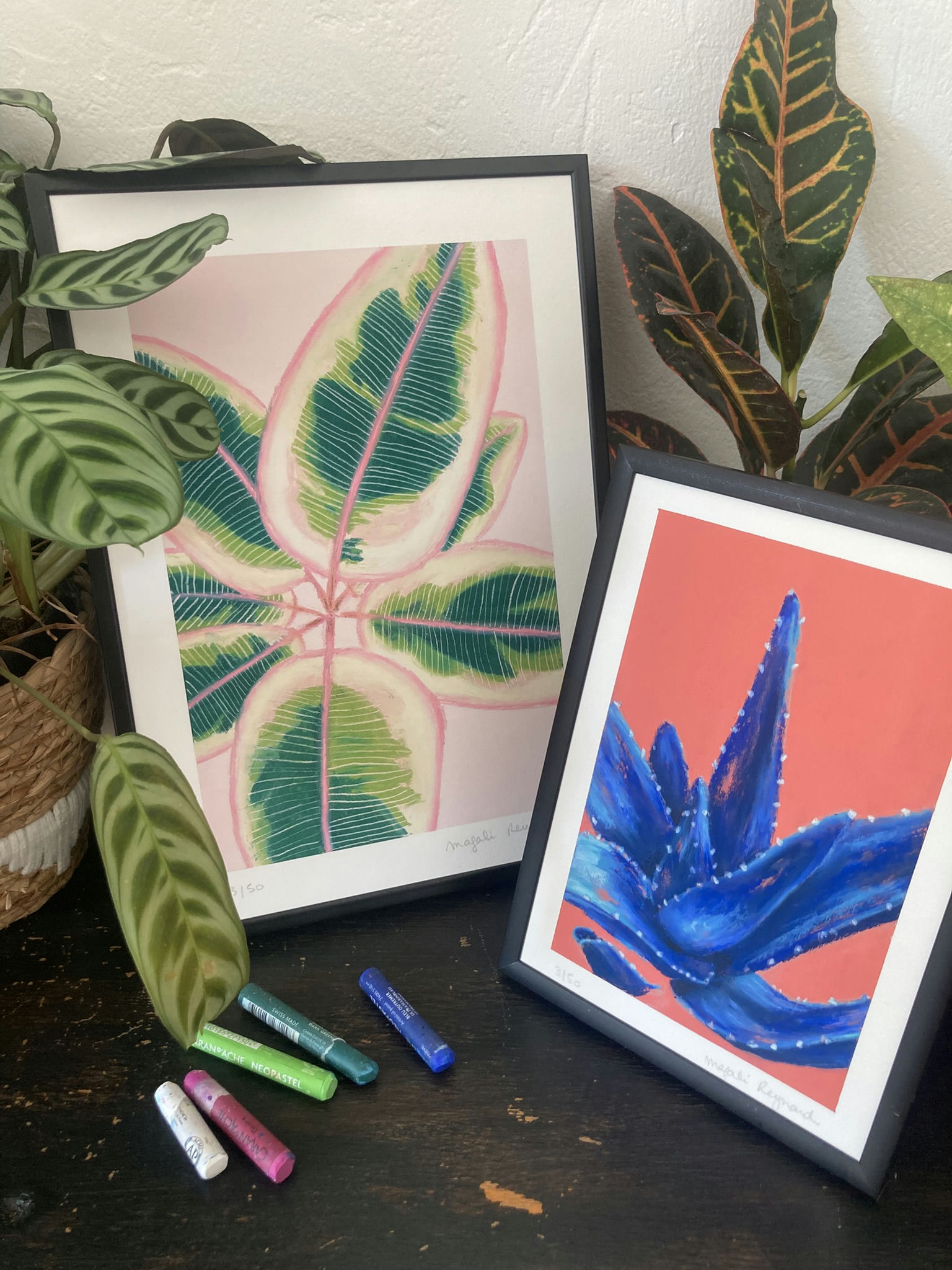 J’aime particulièrement représenter ce que j’aime observer : plantes, scarabées, couchers de soleil, en explorant les contrastes entre force brute et douceur. La couleur, vive et audacieuse, est au cœur de mon travail.